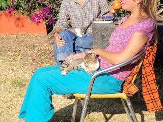 I learned about this residency from Patrica Watts from EcoArtSpace. I was looking for a safe place to go and visit the butterflies, so here I am. I arrived to a full house made up of a young artist couple traveling all throughout Mexico, a dancer within whose family this Hacidenda has been a home for over 6 generations, a married couple who work as puppeteers in San Diego and a Mexican architect currently getting his PHD in Poland. Throughout the weekend we shared fantastic meals cooked up by Alicia the owner and director, took a tour of the grounds where we were introduced to the farm animals living in the roofless barn made of adobe bricks slowly melting back into the earth, and sprouting cactus plants. Chickens, turkeys, 2 giant rabbits and a small herd of sheep who need to be protected from the 3 dogs who live on the grounds outside. There is also a mamma cat who had just had 5 kittens, but only 1 survived an attack by the male cat. So this little guy named Torino was getting a lot of attention. And always trying to get in. Frankie, part of the young couple from Italy and England would bring him in while doing dishes to feed him a bowl of milk.